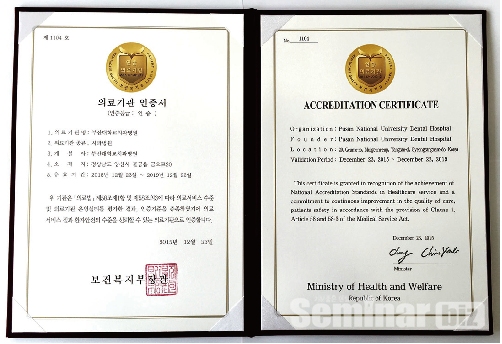 부산대학교치과병원(병원장 김욱규)이 보건복지부로부터 2015년 11월 17일부터 19일까지 인증조사를 거친 후 12월 23일자로 보건복지부 인증의료기관으로 최종 승인 받았다.