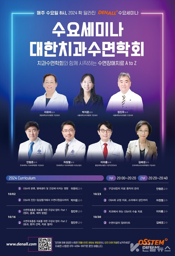 오스템임플란트가 운영하는 치과 종합포털 덴올의 수요세미나가 대한치과수면학회(회장 이유미)와 함께 올해 10월 새로운 강연을 시작한다. 수면이 삶에 미치는 영향에 대한 연구 결과 및 관심도가 증가함에 따라 다양한 주제들로 시청자들과 만날 예정이다.