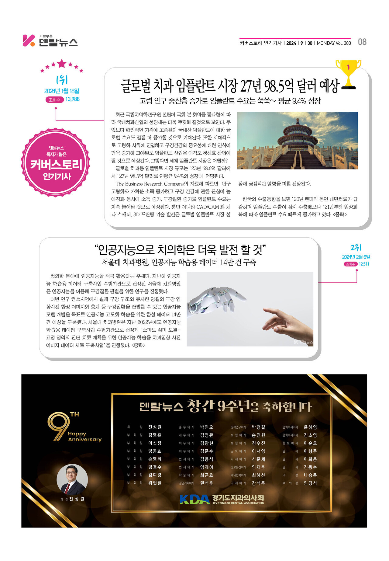 1위 글로벌 치과 임플란트 시장 27년 98.5억 달러 예상 좋아요1훈훈해요0슬퍼요0후속기사 원해요0 글로벌 치과 임플란트 시장 27년 98.5억 달러 예상 “인공지능으로 치의학은 더욱 발전 할 것” 매복치 발치 평균 수가 낮아도 '너무 낮아' 전세계 인구 75%가 부정교합 키워드 #치과 임플란트 시장 #덴탈뉴스인기기사 #인공지능 #서울대치과병원 #인공지능학습용데이터 #매복치발치평균수가 #치관절제술 #덴탈뉴스 덴탈뉴스 webmaster@dentalnews1.com 다른기사 보기 저작권자 © 덴탈뉴스 무단전재 및 재배포 금지 당신만 안 본 뉴스 [알파베러정재욱대표] 좋은 제품 검증된 제품만 모은 알파베러 유한 evertis 임플란트 성공 위한 워크샵 진행 “미용치과 안티에이징이 치과의 블루오션” 덴탈스튜디오, 블랙니들홀더 출시 서울대학교치과병원, 키르기스스탄 장애 어린이위한 사랑의 의료봉사 펼쳐 연송캠퍼스 개관10주년 기념식 및 SID 명예의 전당 제막식 네오바이오텍, 즉시로딩 임플란트 ALX-IT 11월 세미나 전국 진행 [알파베러정재욱대표] 좋은 제품 검증된 제품만 모은 알파베러 개의 댓글 회원로그인 작성자 비밀번호 댓글 내용입력 댓글 정렬 최신순 추천순 답글순 BEST댓글 BEST 댓글 답글과 추천수를 합산하여 자동으로 노출됩니다. 닫기 더보기 댓글삭제 삭제한 댓글은 다시 복구할 수 없습니다. 그래도 삭제하시겠습니까? 비밀번호 닫기 댓글수정 댓글 수정은 작성 후 1분내에만 가능합니다. 본문 / 400 비밀번호 닫기 내 댓글 모음 닫기 주요기사 중국 의료기기 1등급 인허가 취득 점빵치과 고민! 한자리서 해결 완성도높은 투명교정 솔루션 나노라이너 치과의사들의 만성고민 해결 신경치료가 혈당과 지방대사까지 개선 골이식 전략과 덴티움 제품 활용 노하우 공유