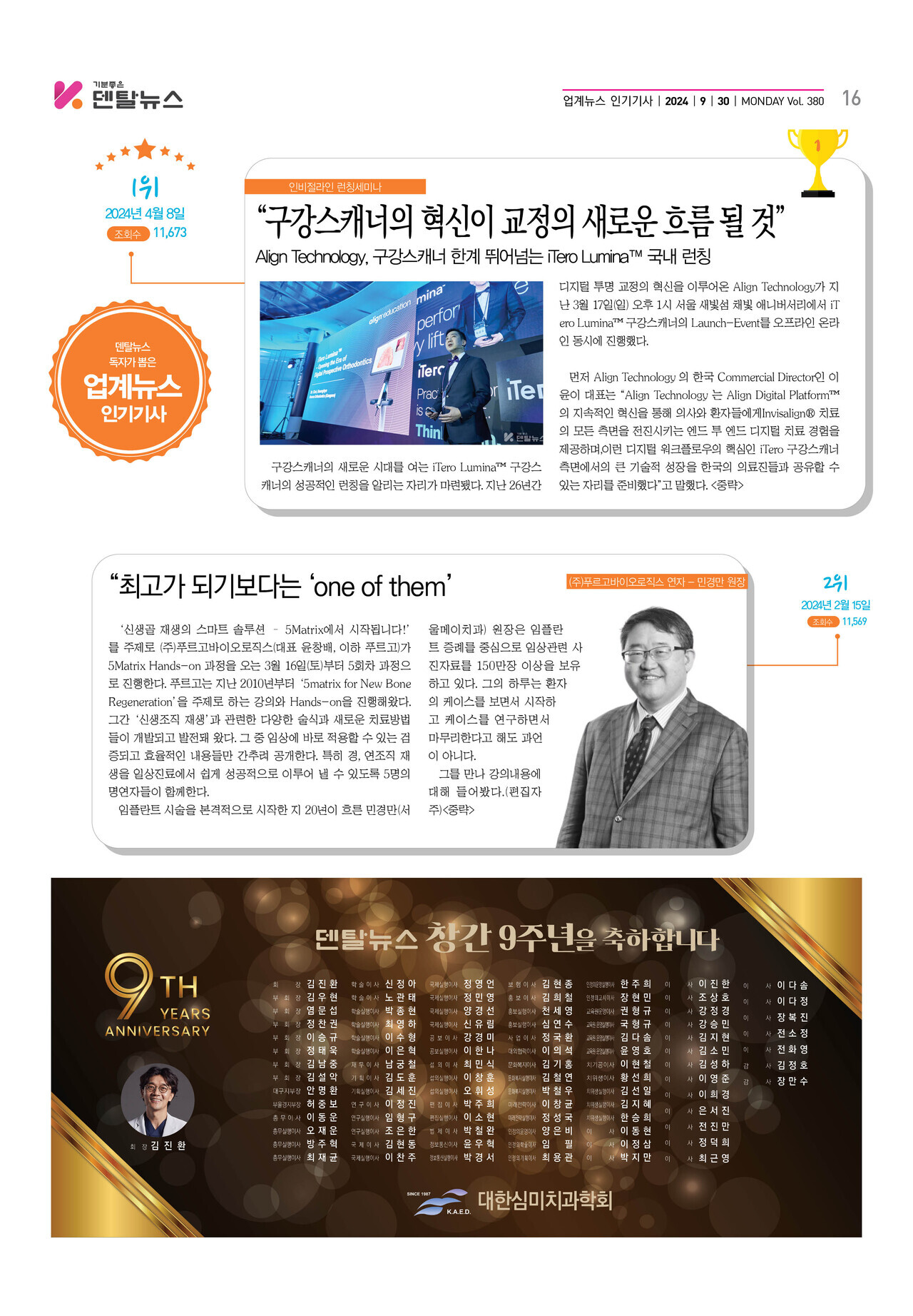 “구강스캐너의 혁신이 교정의 새로운 흐름 될 것” [덴탈뉴스 포토뉴스] iTero Lumina™ 의 성공적인 런칭 현장 [연자를 만나다] 민경만 (서울메이치과) 원장 소아 성장기 환자의 투명교정 길잡이 책 얼라인테크놀로지, ‘iTero Lumina™로 보철 수복치료까지 “인비절라인은 변화의 시작점"