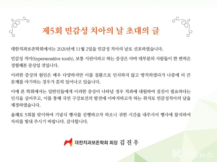 대한치과보존학회 2020년 11월 2일을 민감성치아의 날로 선로 좋아요1훈훈해요0슬퍼요0후속기사 원해요0 키워드 #대한치과보존학회 #민감성치아의날 #민감성치아 #김진우회장 #덴탈뉴스 덴탈뉴스 webmaster@dentalnews1.com 다른기사 보기 저작권자 © 덴탈뉴스 무단전재 및 재배포 금지 당신만 안 본 뉴스 [알파베러정재욱대표] 좋은 제품 검증된 제품만 모은 알파베러 유한 evertis 임플란트 성공 위한 워크샵 진행 “미용치과 안티에이징이 치과의 블루오션” 덴탈스튜디오, 블랙니들홀더 출시 서울대학교치과병원, 키르기스스탄 장애 어린이위한 사랑의 의료봉사 펼쳐 연송캠퍼스 개관10주년 기념식 및 SID 명예의 전당 제막식 네오바이오텍, 즉시로딩 임플란트 ALX-IT 11월 세미나 전국 진행 [알파베러정재욱대표] 좋은 제품 검증된 제품만 모은 알파베러 개의 댓글 회원로그인 작성자 비밀번호 댓글 내용입력 댓글 정렬 최신순 추천순 답글순 BEST댓글 BEST 댓글 답글과 추천수를 합산하여 자동으로 노출됩니다. 닫기 더보기 댓글삭제 삭제한 댓글은 다시 복구할 수 없습니다. 그래도 삭제하시겠습니까? 비밀번호 닫기 댓글수정 댓글 수정은 작성 후 1분내에만 가능합니다. 본문 / 400 비밀번호 닫기 내 댓글 모음 닫기 주요기사 중국 의료기기 1등급 인허가 취득 점빵치과 고민! 한자리서 해결 완성도높은 투명교정 솔루션 나노라이너 치과의사들의 만성고민 해결 신경치료가 혈당과 지방대사까지 개선 골이식 전략과 덴티움 제품 활용 노하우 공유