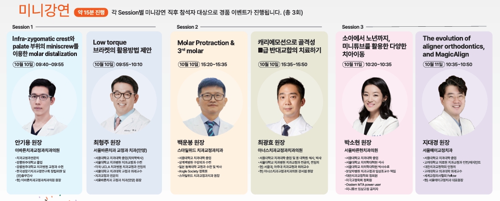 10월 10일(목)에는 안기용 (이바른치과교정과) 원장이 Infra-zygomatic crest와 palate 부위의 miniscrew를 이용한 molar distalization에 대해 강의하며 최형주 (서울바른치과 교정과) 원장은 ‘Low torque 브라켓의 활용방법 제안을 주제로, 백운봉 (스마일위드치과 교정과) 원장은 ‘Molar Protraction & 3rd molar’을 주제로 강의할 예정이다.