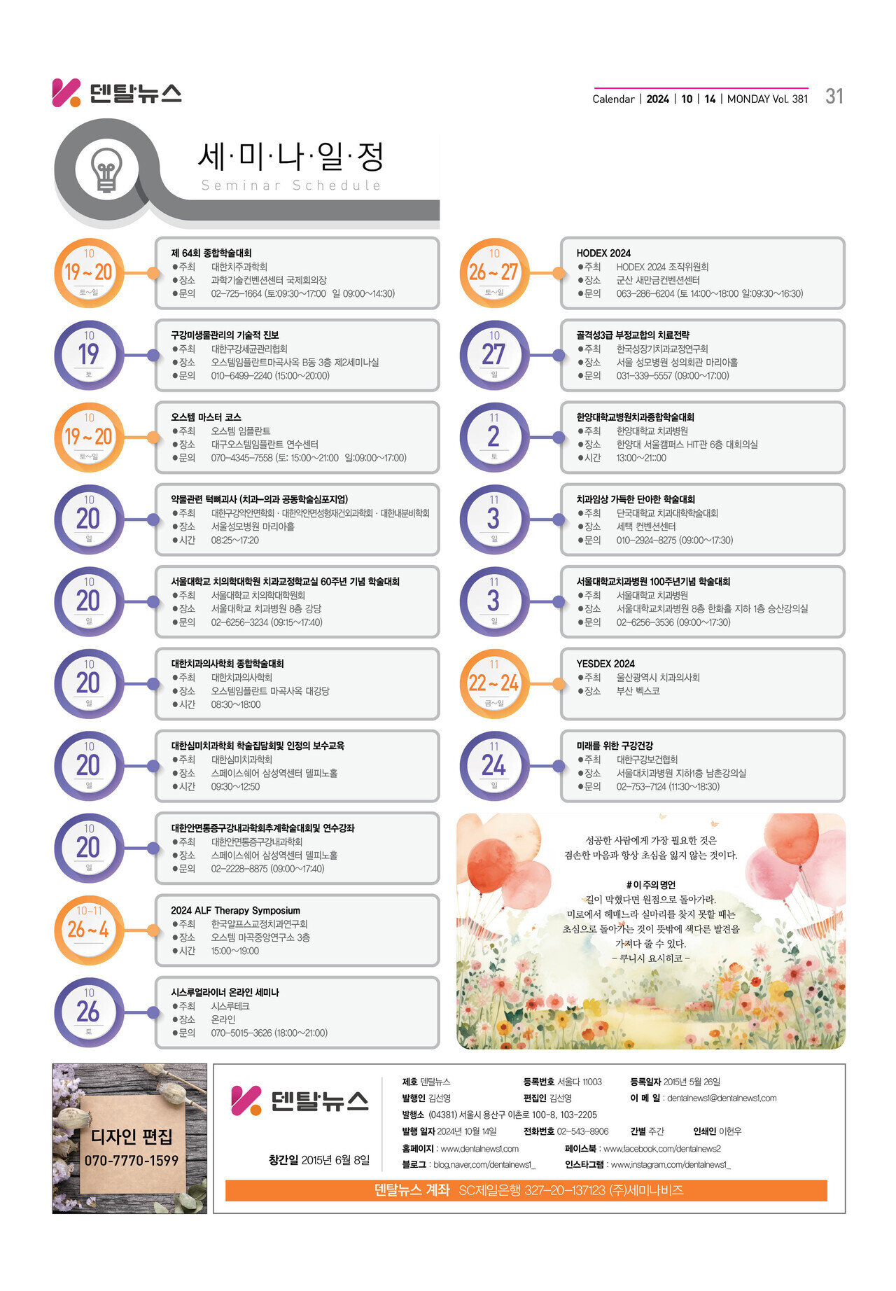 당신만 안 본 뉴스 [알파베러정재욱대표] 좋은 제품 검증된 제품만 모은 알파베러 유한 evertis 임플란트 성공 위한 워크샵 진행 “미용치과 안티에이징이 치과의 블루오션” 덴탈스튜디오, 블랙니들홀더 출시 서울대학교치과병원, 키르기스스탄 장애 어린이위한 사랑의 의료봉사 펼쳐 연송캠퍼스 개관10주년 기념식 및 SID 명예의 전당 제막식 네오바이오텍, 즉시로딩 임플란트 ALX-IT 11월 세미나 전국 진행