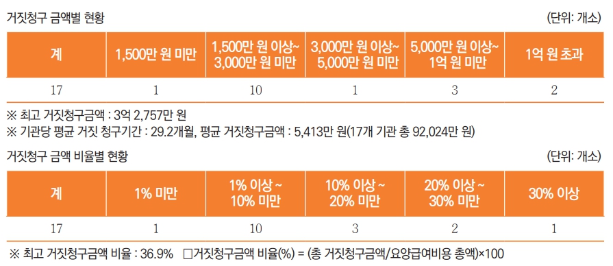 거짓청구금액을 보면 1500만 원 이상 3천만 원 이상이 10개소로 가장 많았다. 거짓 청구 금액이 1억 원을 초과하는 곳도 2개소나 있었다. 거짓청구 비율은 1%이상 10%미만이 가장 많았고 거짓청구 사례로는 실시하지 않은 의료행위를 거짓청구하거나 의료행위 증량 청구 사례가 있었다. 이 두 경우 모두 부당이득금은 환수하고 형법상 사기죄로 고발된다.
