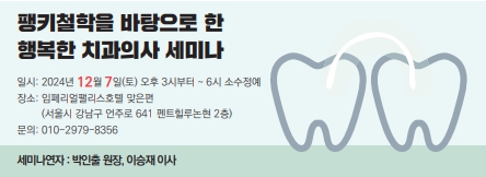 이러한 내용을 중심으로 오는 12월 7일(토) 행복한 치과의사라는 세미나가 진행된다. 치과를 어떻게 운영하며 과대광고 불법광고의 홍수 속에서 특별한 치과를 만드는 방법을 속속들이 밝혀줄 이번 세미나는 내년부터 변화될 수 있는 행복한 치과의사로서의 방향 설정에 큰 도움이 될 것으로 기대된다.
