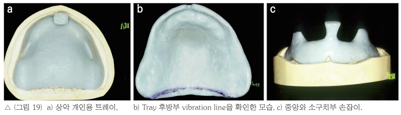 상악의 Closs-fitting tray는 vinyl poly siloxane의 인상을 이용하는 경우에 적합하며, 이 경우에는 undercut area 부위만 block out하고 자가중합 레진을 Tissue reflection point를 연결하는 line에 맞게 적합시켜 만들어 준다. 그리고 치조골의 정 중부와 양측 제1대구치 부위에 손잡이를 만들어 주면 좋다(그림 19c)