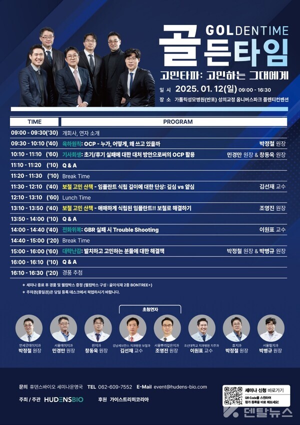 한편, 휴덴스바이오가 주최하고 가이스트리히코리아가 후원하는 이번 골든타임세미나는 올해 초 서울에서 3백 명이상이 참석하는 메머드급 규모로 진행됐으며, 부산, 광주에서도 인기리에 개최됐다. 휴덴스바이오가 국내에 공급하는 OCP는 체내골로 쉽게 변환이 되는 골이식재로 세계최초 대량생산을 통해 한국 유저들을 위해 공급하고 있다.