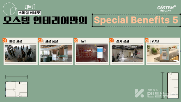 현재 오스템 인테리어는 △빠른 시공 △품질 △loT △전기 공사 △A/S 등 다섯 가지 Special Benefits을 통해 누적 계약 1400호를 돌파하며 치과 인테리어의 새로운 기준을 세웠다는 평가를 받고 있다.