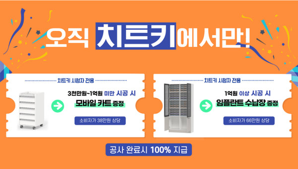 치트키 시청자를 위한 상시 프로모션도 진행 중이다. 치트키 영상 상담 링크를 통해 인테리어 계약이 진행될 경우, 계약 금액에 따라 오스템 모바일 카트 혹은 임플란트 수납장을 증정한다.