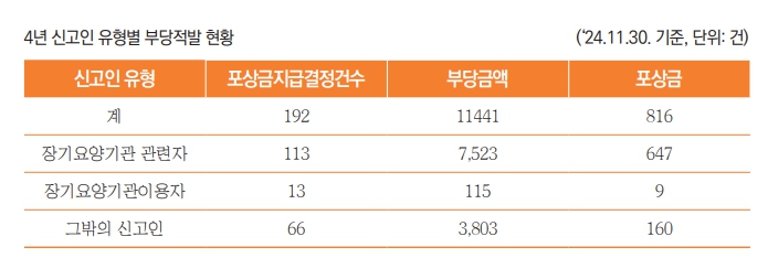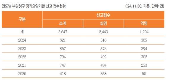 지난해 부당청구 장기요양기관 신고건수 접수현황을 보면 총 821건으로 나타났고 이중 실명은 516건이었으며 익명도 305건에 달했다. 신고건수는 2020년 418건에서 2024년 821건으로 2배 가까이 증가했다. 지난 4년간 신고된 건수는 총 3,647건에 달했다.