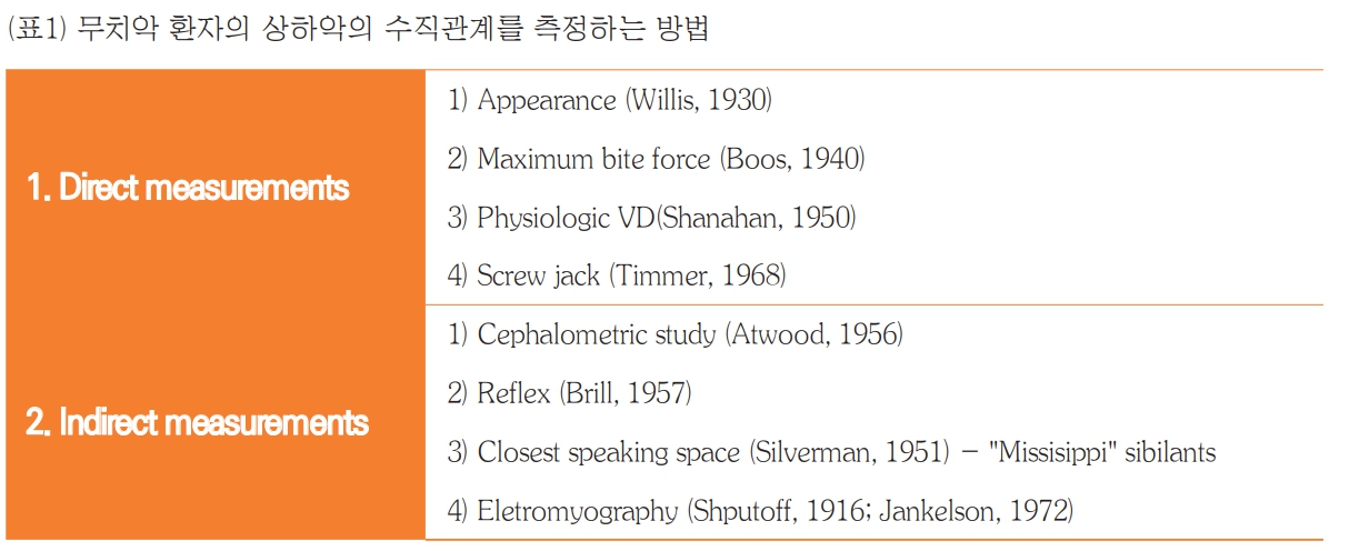 무치악 환자의 상하악의 수직관계를 측정하는 방법은 (표 1)과 같이 직접 측정하는 방법과 간접적으로 측정하는 방법 등 여러 가지 방법이 있다. 그러나 현재까지 Reflex에 의한 간접적인 측정방법이 흔히 이용되고 있다.