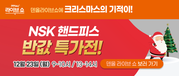 [덴탈뉴스=홍혜진 기자] 우수한 품질의 제품을 합리적인 가격에 선보여 치과의사들에게 호평받는 덴올 라이브쇼가 크리스마스를 맞아 23일 반값 특가 할인전을 진행한다. 이번 특가전에서는 핸드피스의 명가 NSK社에서 제조한 OSSTEM 핸드피스를 특별한 가격에 구입할 수 있도록 구성했다.