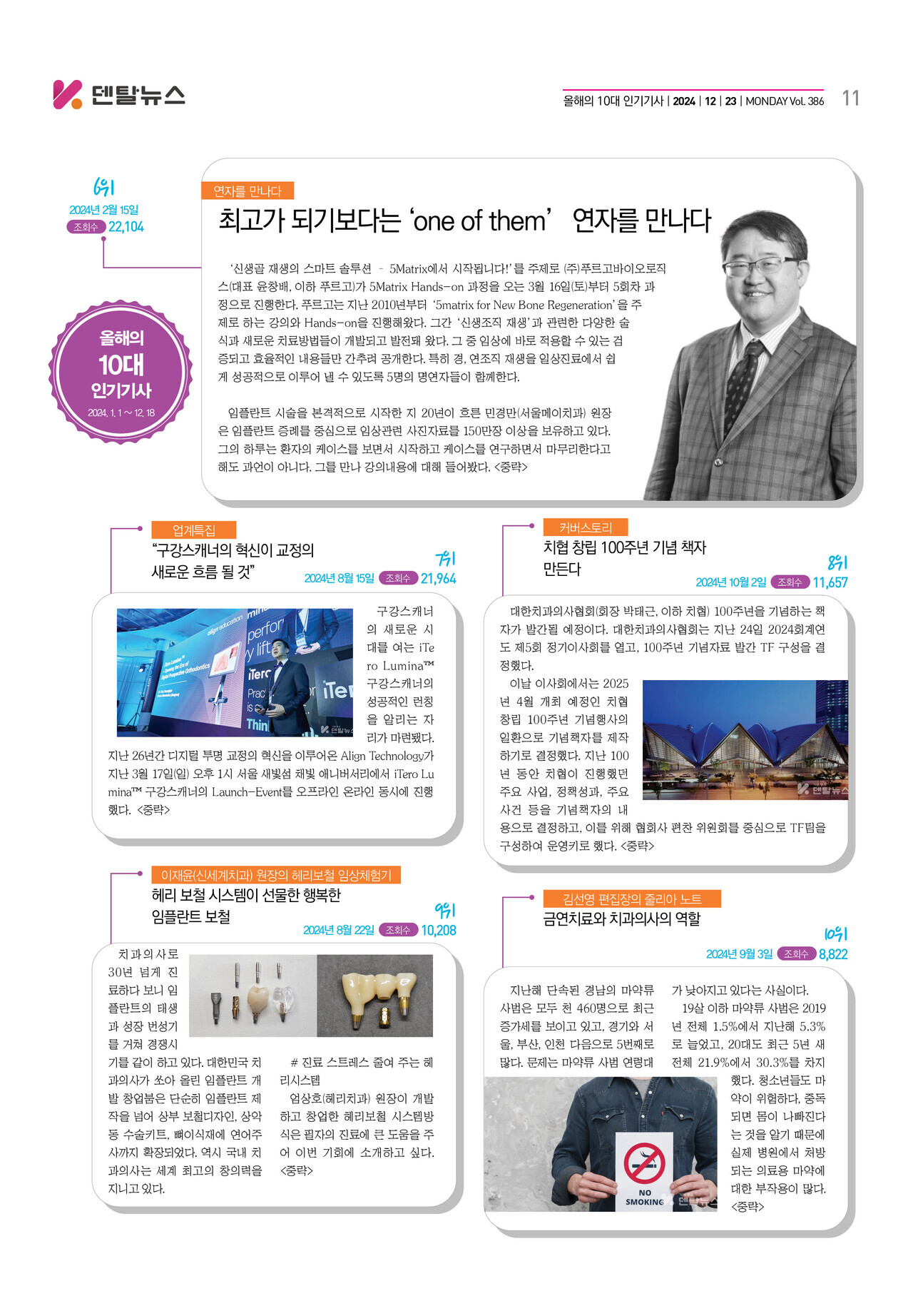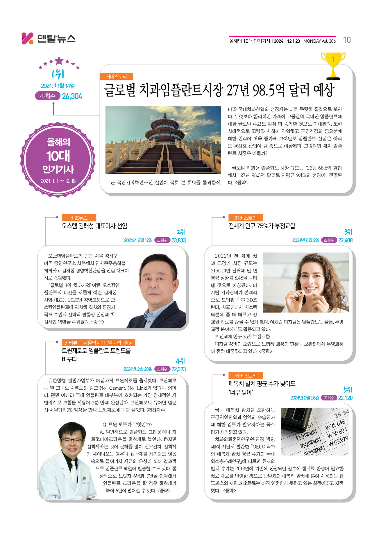 글로벌 치과 임플란트 시장 27년 98.5억 달러 예상 오스템, 김해성 신임 대표이사 선임 전세계 인구 75%가 부정교합 트윈제로로 임플란트 트렌드를 바꾸다 매복치 발치 평균 수가 낮아도 '너무 낮아' [연자를 만나다] 민경만 (서울메이치과) 원장 “구강스캐너의 혁신이 교정의 새로운 흐름 될 것” 치협 창립 100주년 기념 책자 만든다 헤리 보철 시스템이 선물한 행복한 임플란트 보철 [김선영편집장] 금연치료와 치과의사의 역할