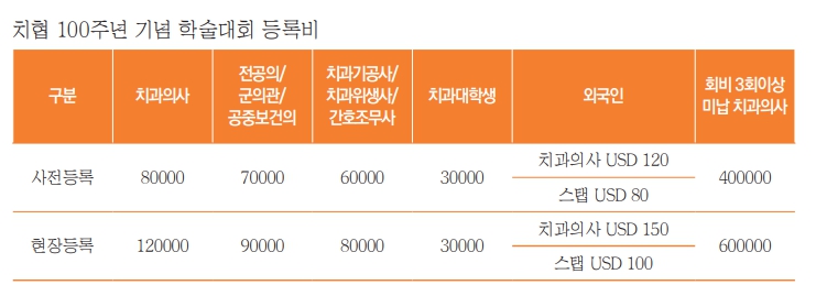 등록비용 또한 개원가의 어려움을 반영, 치과계 보통 학술 대회와 비슷한 수준으로 책정했다. 다만 회비 미납 내역이 3회 이상인 치과의사는 사전등록과 현장등록 비용의 차등이 있는 만큼, 등록 전에 반드시 확인해야 한다.