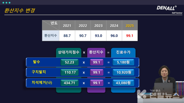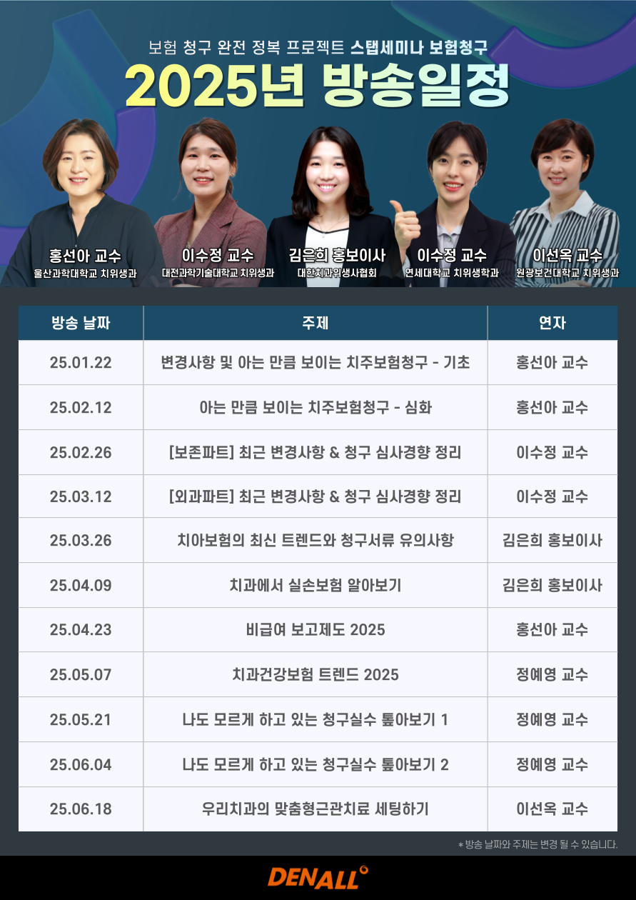 덴올에 따르면 올해 상반기 '스탭세미나: 보험청구'는 건강보험 및 치과 보험 청구 실무 강화에 초점을 맞춘다. 치주보험, 보존·외과 파트, 비급여 보고제도, 청구 실수 분석 등 실무 중심의 교육을 제공한다. 특히 실무자들이 놓치기 쉬운 청구 실수와 최신 트렌드만 콕 짚어 주는 강의도 준비한 만큼 시청자들의 관심도 높을 것으로 기대된다.