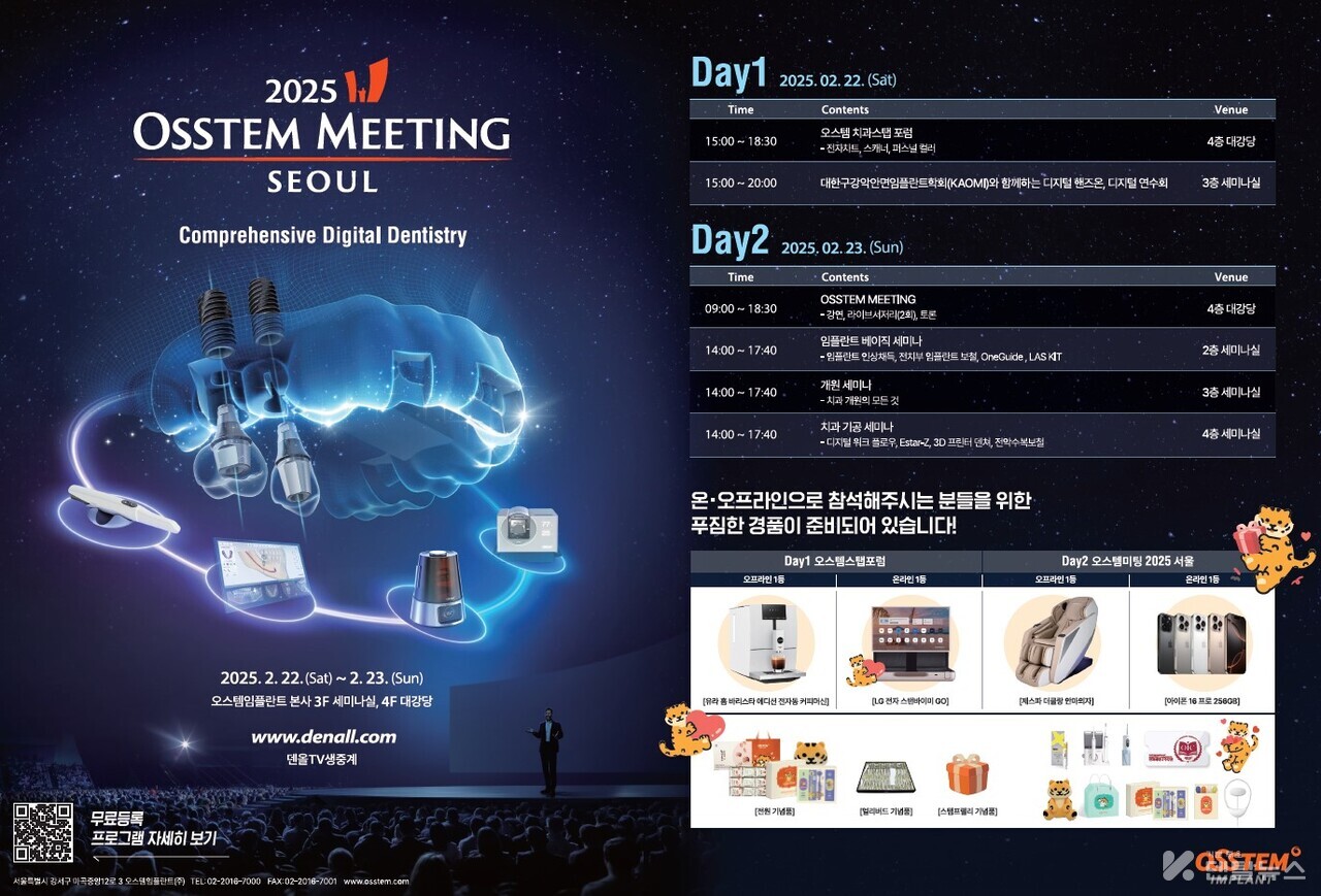 이번 오스템미팅은 'Comprehensive Digital Dentistry'를 대주제로 온라인과 오프라인에서 모두 즐길 수 있도록 치과 종합 포털 덴올과 유튜브를 통해 실시간 생중계될 예정이며 풍성한 경품도 각각 준비돼 있다.