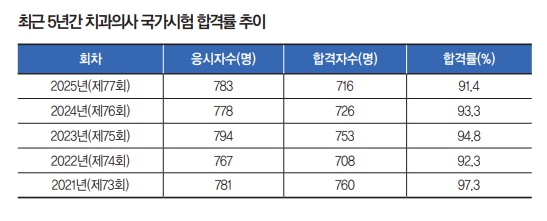 제77회 치과의사 국가시험은 전체 783명의 응시자 중 716명이 합격하였고, 합격률은 91.4%이다.