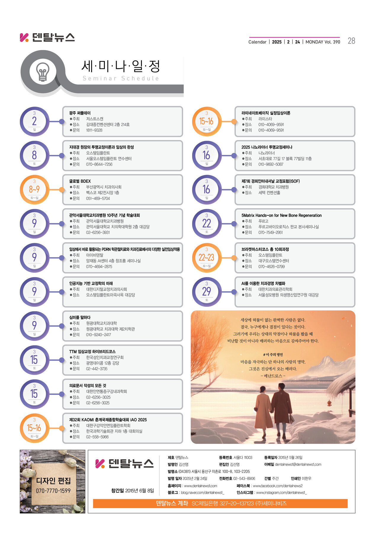 당신만 안 본 뉴스 [알파베러정재욱대표] 좋은 제품 검증된 제품만 모은 알파베러 유한 evertis 임플란트 성공 위한 워크샵 진행 “미용치과 안티에이징이 치과의 블루오션” 덴탈스튜디오, 블랙니들홀더 출시 서울대학교치과병원, 키르기스스탄 장애 어린이위한 사랑의 의료봉사 펼쳐 연송캠퍼스 개관10주년 기념식 및 SID 명예의 전당 제막식 네오바이오텍, 즉시로딩 임플란트 ALX-IT 11월 세미나 전국 진행