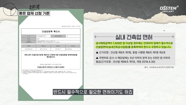 첫 번째 주제로는 '전문 면허 확인'이 다뤄진다. 이는 안전한 공사는 물론 사후 발생할 수 있는 법률적 문제도 야기할 수 있기 때문에 반드시 확인해야 하는 내용이다.