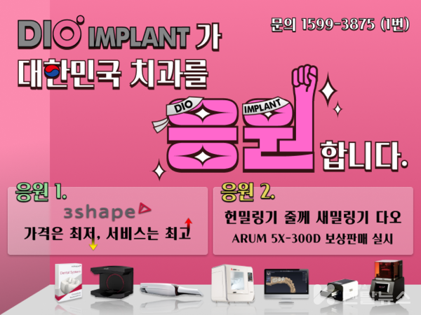 [덴탈뉴스=홍혜진 기자] 디지털 덴티스트리 선도기업 디오임플란트(대표 김종원, 이하 디오)가 특별 프로모션을 진행한다. 최신 장비를 더욱 저렴한 가격에 구입하거나, 노후화된 장비를 새 제품으로 교체할 수 있는 특별 프로모션이다.