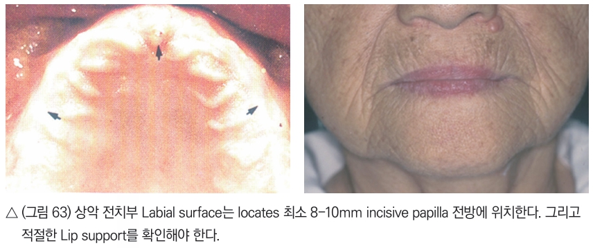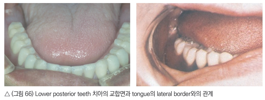 하악 전치부위는 안정위에서 incisal 1/3정도 보이는 것이 일반적이며(그림 65), 하악 구치부의 교합면은 (그림 66)과 같이 혀의 lateral border보다 약간 높게 형성되어야 한다.
