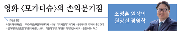 [덴탈뉴스=조정훈원장 ] KOBIS(영화관입장권 통합전산망)에 따르면 김윤석·조인성 주연의 영화 <모가디슈>의 관객 수는 3,611,644명(2021년 10월 기준)에 이르렀다. 코로나19 사태에 극장에 간다는 것도 조심스러운데 300 만 명 넘게 극장을 찾아 준 것은 영화계 입장으로서 참 고마운 일이다.