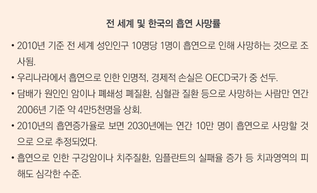 전세계 흡연자는 2010년 기준 인구 6명 중 1명꼴인 11억명에 달하며, 이 중 5억 명 이상이 담배로 인해 사망할 것이라고 세계보건기구(WHO)가 밝혔다. WHO 보고서는 남자는 세계인구의 40~45%, 여자는 10~12%가 담배를 피우고 있으며 매년 3백 50만명이 흡연관련 질병으로 사망하고 있다고 집계했다. 2020년에는 흡연자 비율이 전체의 12%를 넘어서 매년 1 천만명이 희생될 것으로 전망됐다. 이는 AIDS, 결핵, 교통사고, 자살, 분쟁학살등에 의한 사망자를 모두 합친 것보다 더 많은 수치다.