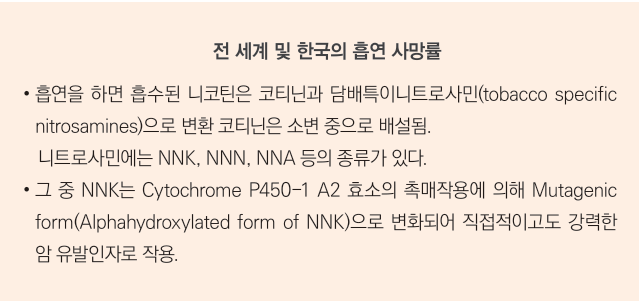 니트로사민류는 이처럼 식이를 통한 노출뿐만 아니라 대기오염 등 환경에서 유래되는 노출에 의한 위험성도 증가되고 있다. 니트로사민에는 NNK, NNN, NNA 등의 종류가 있다. 그 중 NNK는 Cytochr ome P450-1 A2 효소의 촉매작용에 의해 Mutagenic form (Alphahydroxylated form of NNK)으로 변화되어 직접적이고도 강력한 암 유발인자로 작용하게 된다.