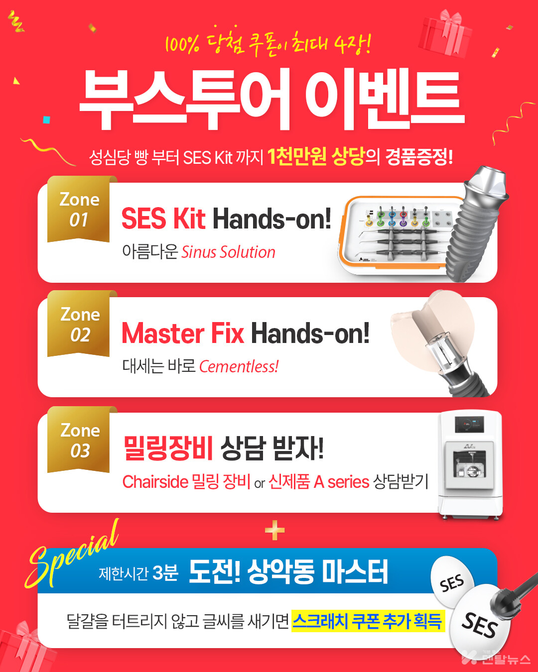 한편, 아름덴티스트리 부스에서는 부스 투어 이벤트 참여자 전원에게 100% 당첨 스크래치 쿠폰을 최대 4장까지 증정하며, 총 1천만 원 상당의 경품과 함께 신제품 현장 특판 및 추가 증정 혜택을 제공할 예정이다.