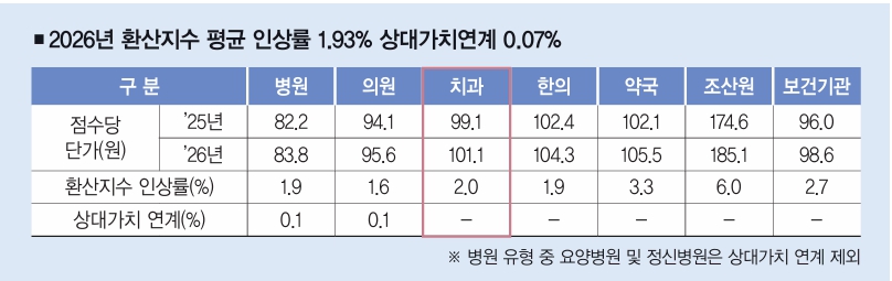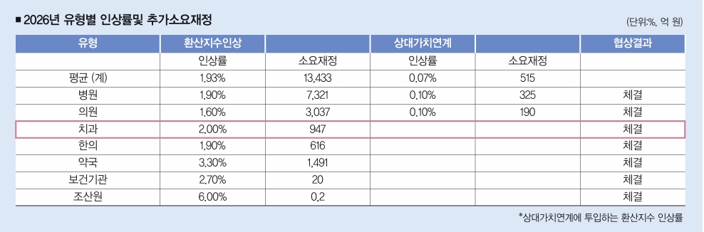 협상 결과, 2026년도 평균 환산지수 인상률 1.93%(1조 3,433억 원), 상대가치 연계 0.07%(515억 원)이다.