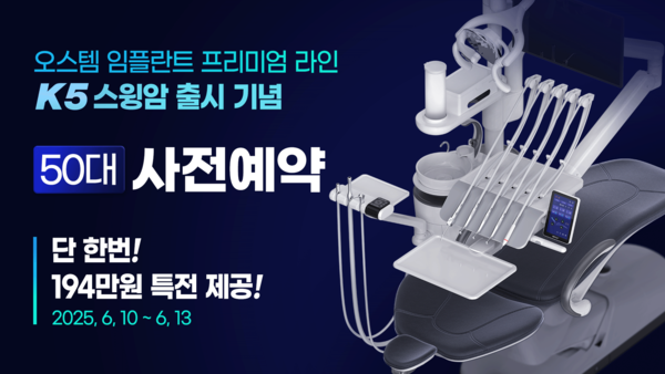덴올 라이브쇼는 오는 10일부터 13일까지 오스템임플란트의 프리미엄 유니트체어 'K5 스윙암' 출시를 기념해 단 50대 한정 물량과 역대급 프로모션으로 사전 예약 방송을 진행한다고 밝혔다.