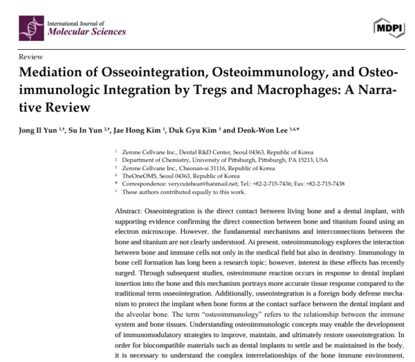 논문 제목은 ‘조절 T세포와 대식세포에 의한 골융합, 골면역학 및 골면역학적 융합의 중재(Mediation of Osseointegration, Osteoimmunology, and Osteoimmunologic Integration by Tregs and Macrophages: A Narrative Review)’로 임플란트 시술 후 일어나는 골융합(Osseointegration) 과정을 조절 T세포(Tregs)와 대식세포(Macrophage)의 골형성 조절 활성을 기초로 해 면역학적으로 해석했다.