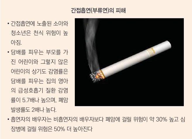담배를 피우는 남편과 함께 사는 여성이 폐암에 걸릴 확률은 그렇지 않은 여성의 1.2~3.1배, 아버지가 흡연하는 가정의 자녀가 급성호흡기질환에 걸릴 확률은 그렇지 않은 경우보다 5.7배가 높아지는 것이다. 부모가 흡연하면 자녀에게는 1년에 무려 80개비 이상의 담배를 피우는 효과가 나타난다고 한다. (연세대학교 의과대학 예방의학교실 발표)