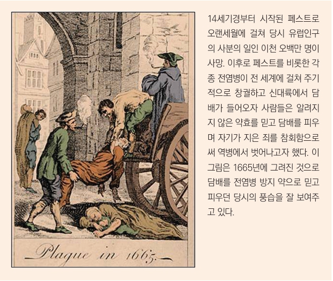 이 그림은 1665년의 중세기 유럽에서 유행하던 전염병으로 인한 참상을 그린 것으로 담배를 역병의 방패 막이로 삼고 있었던 사실을 보여준다. 역병이 유행하던 당시의 ‘장 드베네트’를 비롯한 당대 편년 사가들은 “그해와 이듬해 파리를 비롯해 프랑스 전역은 물론 풍문에 따르면 다른 나라에서도 수많은 사 람들이 떼죽음을 당했다. 남녀를 불문하고 숱한 이들이 죽음을 맞이했다. 노인보다는 젊은이의 희생이 더 컸다. 얼마나 많은 이들이 전염병으로 죽었는지 우리가 할 수 있는 일이라곤 그저 주검을 매장하는 것뿐이었다.”라고 기술하고 있다.