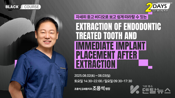 [덴탈뉴스=홍혜진 기자] 덴탈빈(대표 박성원, 서성동)이 오는 8월 2일 3일 양일간 조용석(조용석 김세웅치과) 원장의 근관치료된 치아 발치 & 발치 후 즉시식립 핸즈온 세미나”를 진행한다.