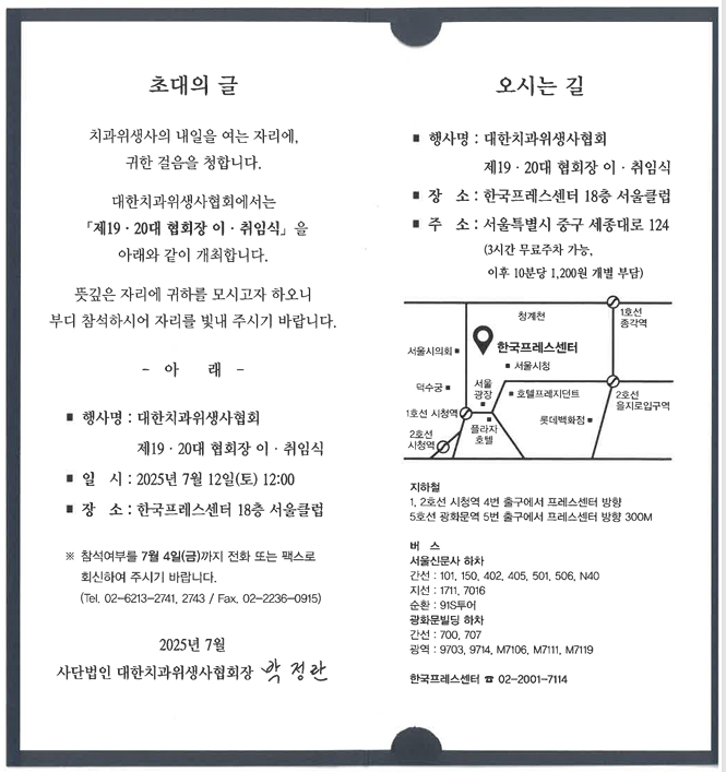 12시 프레스센터 18층 [덴탈뉴스=덴탈뉴스 ] 대한치과위생사협회 제19대. 20대 협회장 이취임식이 7월 12일(토) 12:00한국프레스센터 18층 서울 클럽에서 개최된다. 좋아요3훈훈해요0슬퍼요0후속기사 원해요0 키워드 #대한치과위생사협회 #박정란협회장 #덴탈뉴스 #치과위생사 #박정란회장취임식 덴탈뉴스 webmaster@dentalnews1.com 다른기사 보기 저작권자 © 덴탈뉴스 무단전재 및 재배포 금지 당신만 안 본 뉴스 [알파베러정재욱대표] 좋은 제품 검증된 제품만 모은 알파베러 유한 evertis 임플란트 성공 위한 워크샵 진행 “미용치과 안티에이징이 치과의 블루오션” 덴탈스튜디오, 블랙니들홀더 출시 서울대학교치과병원, 키르기스스탄 장애 어린이위한 사랑의 의료봉사 펼쳐 연송캠퍼스 개관10주년 기념식 및 SID 명예의 전당 제막식 네오바이오텍, 즉시로딩 임플란트 ALX-IT 11월 세미나 전국 진행 [알파베러정재욱대표] 좋은 제품 검증된 제품만 모은 알파베러 개의 댓글 회원로그인 작성자 비밀번호 댓글 내용입력 댓글 정렬 최신순 추천순 답글순 BEST댓글 BEST 댓글 답글과 추천수를 합산하여 자동으로 노출됩니다. 닫기 더보기 댓글삭제 삭제한 댓글은 다시 복구할 수 없습니다. 그래도 삭제하시겠습니까? 비밀번호 닫기 댓글수정 댓글 수정은 작성 후 1분내에만 가능합니다. 본문 / 400 비밀번호 닫기 내 댓글 모음 닫기 주요기사 중국 의료기기 1등급 인허가 취득 점빵치과 고민! 한자리서 해결 완성도높은 투명교정 솔루션 나노라이너 치과의사들의 만성고민 해결 신경치료가 혈당과 지방대사까지 개선 골이식 전략과 덴티움 제품 활용 노하우 공유