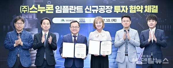 [덴탈뉴스=김선영 기자] ㈜스누콘(대표 박영우)이 대구시와 치과용 임플란트 신규공장 2곳 건립을 위한 투자협약식이 10일 대구시청 산격청사에서 개최됐다. <사진>