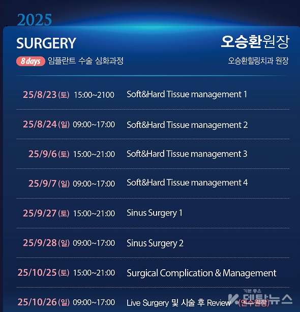 8월 열리는 대전 마스터코스 SURGERY 과정은 덴올홈페이지(https://education.denall.com/course-apply/143/Y)나 별도 페이지를 통해 신청 가능하다. 공보의와 수련의, 군의관 등은 증명서류 제출 시 50% 할인도 가능하다.