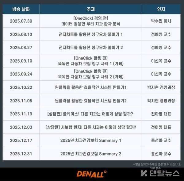 덴올에 따르면 2025년 하반기 스탭세미나는 전자차트 OneClick을 활용한 보험청구와 상담 효율화를 주제로 오는 7월 30일부터 12월 31일까지 방송된다. 이번 방송에서는 환자 데이터 분석, 청구 오류 최소화, 사보험 환자 대응, 상담 프로세스까지 통합 운영 전략이 소개될 예정이다.