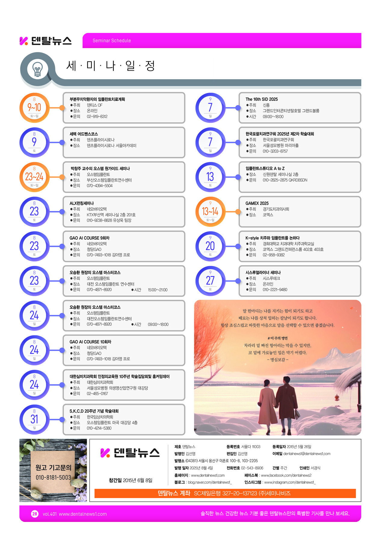 당신만 안 본 뉴스 [알파베러정재욱대표] 좋은 제품 검증된 제품만 모은 알파베러 유한 evertis 임플란트 성공 위한 워크샵 진행 “미용치과 안티에이징이 치과의 블루오션” 덴탈스튜디오, 블랙니들홀더 출시 서울대학교치과병원, 키르기스스탄 장애 어린이위한 사랑의 의료봉사 펼쳐 연송캠퍼스 개관10주년 기념식 및 SID 명예의 전당 제막식 네오바이오텍, 즉시로딩 임플란트 ALX-IT 11월 세미나 전국 진행