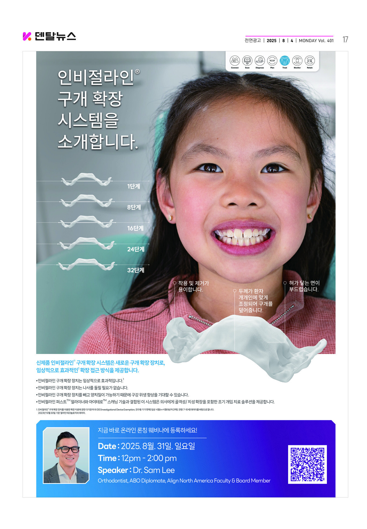 [덴탈뉴스=덴탈뉴스 ]오는 8월 31일(일) 낮 12시부터 2시간동안 인비절라인의 신제품인 구개확장시스템에 대한 임상적 효과를 증명하는 Dr. Sam Lee의 웨비나 강의가 진행된다.