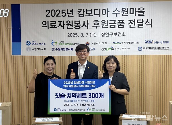 [덴탈뉴스=홍혜진 기자] 수원시치과의사회(회장 민봉기)는 지난 7일 장안구보건소에서 열린 ‘2025년 캄보디아 수원마을 의료자원봉사 후원금품 전달식’에 참여해 칫솔, 치약세트 300개를 전달했다.