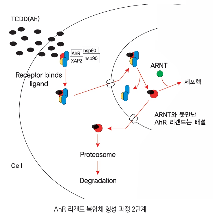 세포질에서 heat shock protein 90과 결합된 형태로 발견되는 AhR은 Ah, 즉 TCDD에 노출된 후 Ah와 결합하여 AhR 리갠드(Ligand)를 형성한다. 즉 수용체에 효현제가 결합되어 다이옥신이 몸에 해로운 효현제로써의 단계적인 역할을 시작하는 것이다.