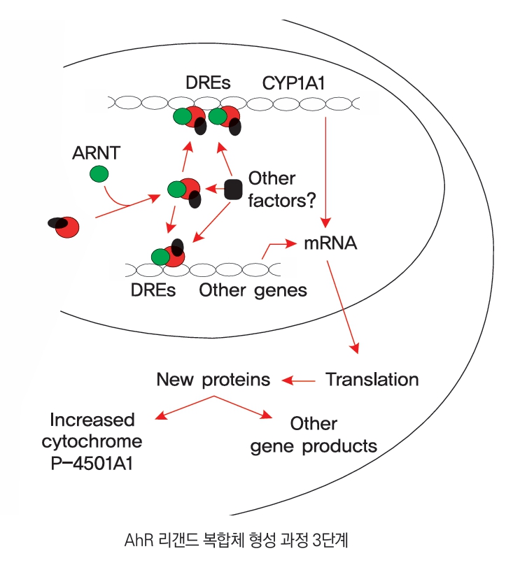 AhR nuclear translocator(ARNT)와 만난 AhR 리갠드 복합체는 다수의 phase Ⅰ과 phase Ⅱ 효소유전자 촉진인자의 상류에 위치한 TCDD반응 증강인자 부위 에 있는 DNA와 결합하는데 이때 세포의 정상적인 전사과정, 즉 질서를 파괴하여 교란시키는 해로운 물질이 생성되는 것이다. 이때 생성되는 효소유전자 중 가장 유해한 것이 바로cytochrome p450 1A1(CYP1A1)효소이다.