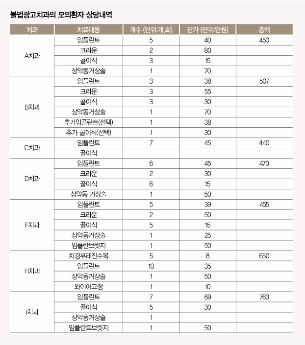 끝으로 모의환자 조사를 통해 서울 G구 소재의 불법광고 치과 10곳을 임의 선정하여 방문해 임플란트 상담을 받아 비교 조사하였다.