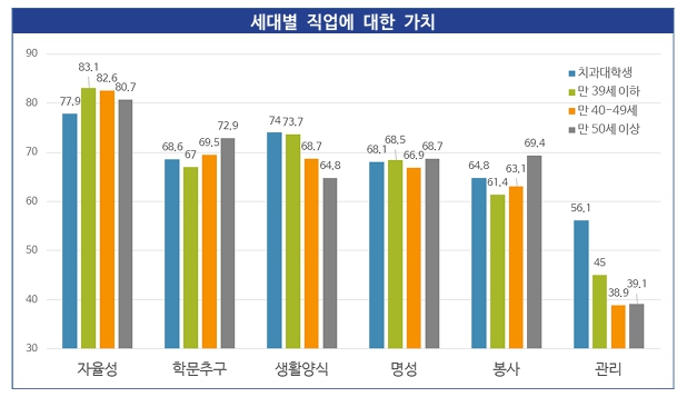 치과의사의 직업가치를 파악하고자 설문을 통해 조사한 결과, 연령대 별로 추구하는 가치에 차이가 있었다. 설문 결과를 종합하면, 젊은 치과의사들은 자율성, 생활양식(금전적 성공), 관리(대형 치과 운영)에 대한 관심이 높았다. 반면 연령이 높을수록 학문추구와 봉사를 중요하게 여기는 경향이 강해지는 것으로 나타났다.