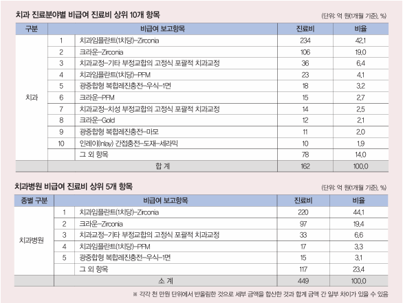 항목별 비급여 진료비 규모는 상급병실료 1인실이 553억 원(9.6%)으로 가장 컸다. 이어 도수치료 478억 원(8.3%), 치과 임플란트(1치당)-지르코니아(Zirconia) 234억 원(4.1%) 순이었다. 지르코니아는 치과보철용 재료 중 높은 강도와 내구성을 가진 치아색과 유사한 세라믹 재료다. 상위 10개 항목이 전체 비급여 진료비의 41.6%를 차지했다.