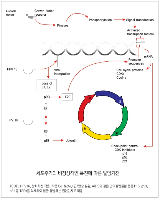 p16, p53, p21 등으로 일컫는 이러한 TSPs들은 비정상적인 세포주기를 차단시 키는 것으로 알려졌다. 그런데 암으로 발전한 병소에서는 이들 유전자의 돌연변이 가 자주 관찰되고 이에 따라 TSPs의 세포주기 억제 기능이 소실되어 세포주기의 과 활성상태가 나타난다. 이러한 과정에서 세포의 유전자에 돌연변이를 일으켜 TSPs 를 억제함으로써 암을 유발하는 원인인자로는 담배연기 속의 TCDD와 같은 각종 발암성 화학물질이나 HPV16과 같은 바이러스, 광화학선 작용, 각종 급, 만성질환, Co-factor, AIDS와 같은 면역결핍성 또는 감염성 질환 등이다.