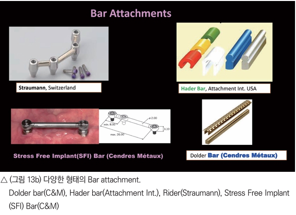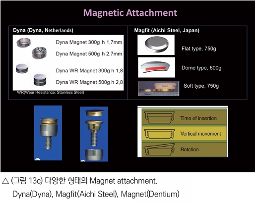 그 자료에 의하면 전반적인 환자의 만족도는 큰 차이는 없으나, Bar attachment 하방의 세심한 치태 및 치주관리가 요구되고 Magnet attachment는 overdenture의 stability와 retention이 다른 attachment에 비해 떨어진다고 보았다. 최근 여러회사에서 다양한 형태의 Stud attachment가 소개되고 있고 사용의 편리성 때문에 Stud attachment가 널리 이용되고 있다고 본다. 그리고 attachment의 부피를 각 환자의 denture space를 고려해서 선택하는 것도 중요하다.