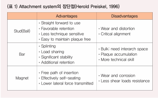 Attachment system의 선택은 그 용도와 임상상황에 따라 선택할 수 있다. Attachment system를 선택할 때 무엇보다 중요한 점은 각 attachment system의 특성과 기능을 파악하고 증례에 따라 가장 적절한 system을 선택해야 한다는 것이다. Dr. Herold Preiskel(1996)은 다음과 같이 attachment system의 종류와 장단점을 기술하였다(표 1).